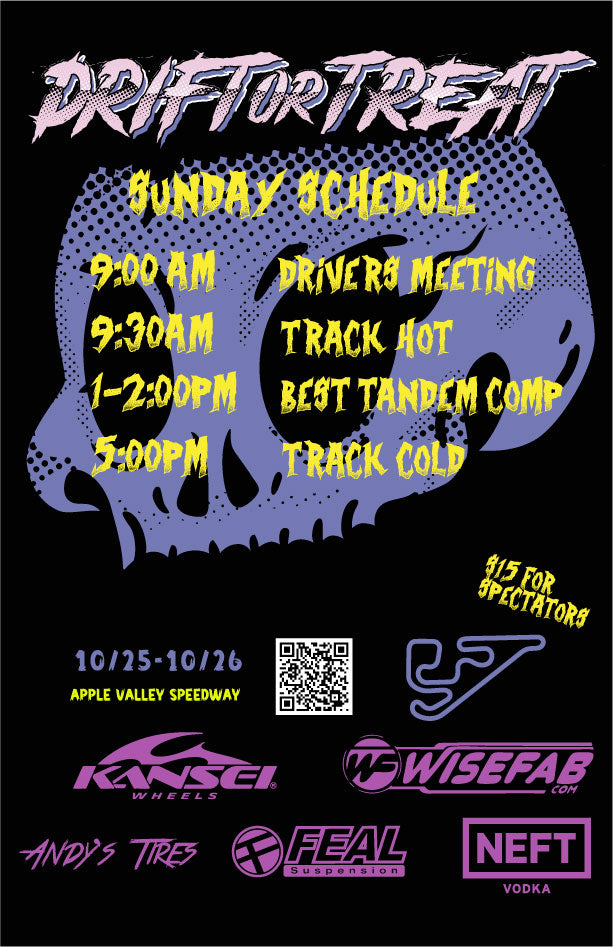 Join us at Apple Valley Speedway on October 25th and 26th for a drift event like no other. We're bringing together the best of the drifting world for two days of high-horsepower, sideways fun. You'll get to see special guest drivers, including many Formula Drift pros, as they push their cars to the limit and show off their incredible skills.