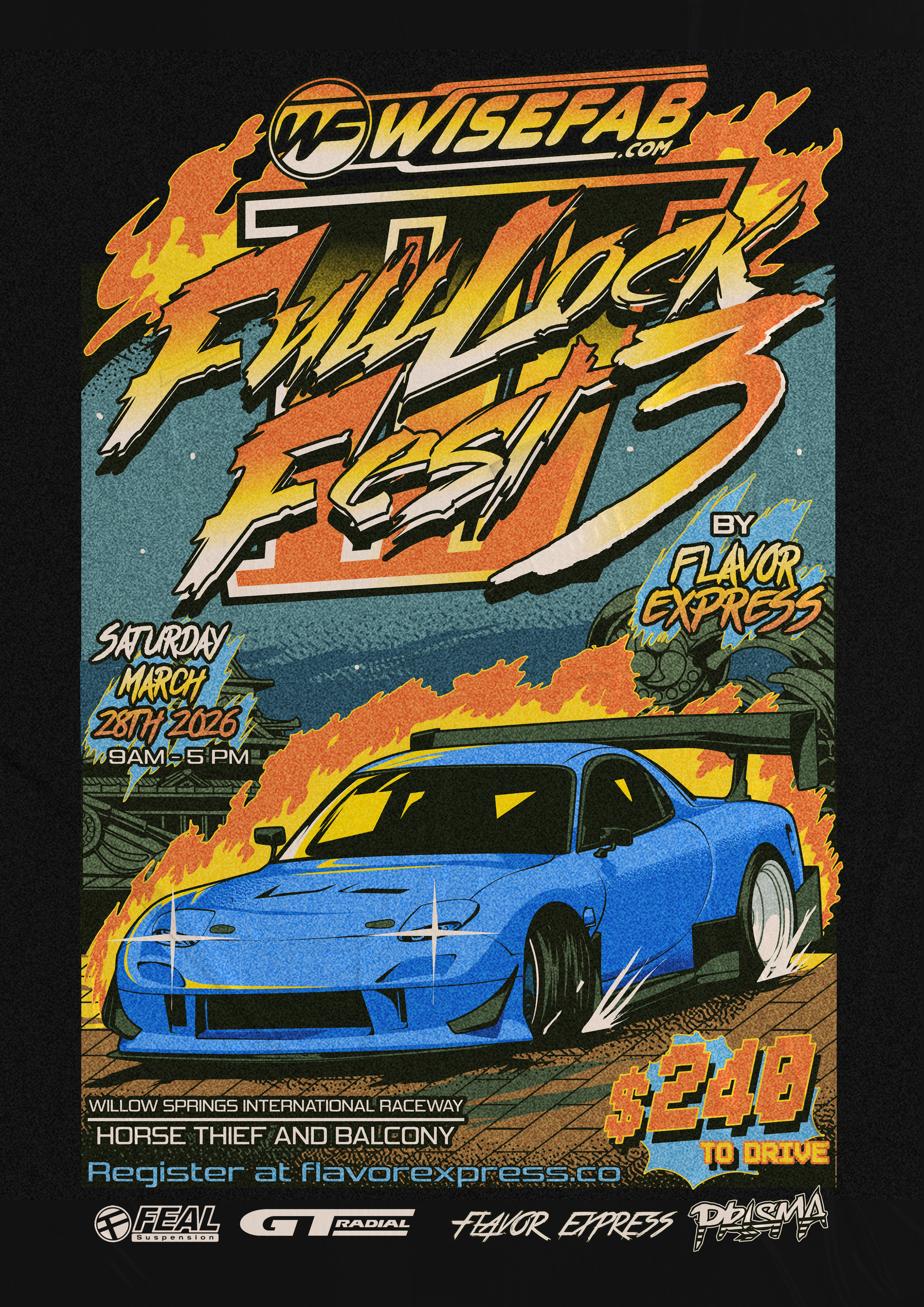 Wisefab X Flavor Express Full Lock Fest 3 at Willow Springs International Raceway! Saturday March 28th from 9am - 5pm Horse Thief and Balcony!